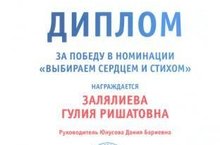 Залялиева Гулия, обучающаяся 11 А класса одержала победу в номинации"Выбираем сердцем и стихом" на V Республиканском творческом конкурсе среди детей и молодёжи "Мы - граждане России!".Руководитель учитель русского языка и литературы Юнусова Дания Бариевна. Поздравляем