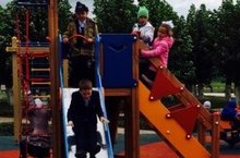 Ученики первых классов во время динамической паузы играют в парке. Детям очень понравилась новая горка