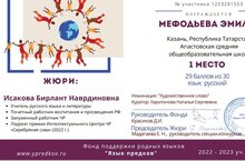 Ученица 7б класса Мефодьева Эмилия (учитель Харитонова Н.С.) приняла участие в IV Международном конкурсе "Палитра культур", организованном фондом поддержки родных языков "Язык предков" и проводимом с ноября по декабрь 2022 года. В конкурсе приняли участие 923 работы на 41 языке. Эмилия участвовала в номинации "Художественное слово" и удостоилась 1 места. Поздравляем Эмилию с победой и желаем ей дальнейших успехов!