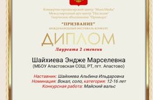 Дипломом лауреата награждена победитель международного конкурса "Призвание" Шайхиева Э.