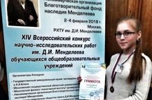 Учащаяся 11 класса Вероника Кузьмина стала призером республиканского этапа Всероссийского конкурса исследовательских работ им.Д.И.Менделеева, и была приглашена на заключительный этап данного конкурса в город Москву. Там Вероника стала лауреатом конкурса. Поздравляем, Вероника, тебя и желаем дальнейших успехов!