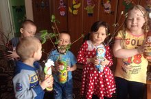 Булмэгэ яз килде балалар белэн без булмэгэ яз керттек . Тэрэзэ пэодэсенэ элу очен язгы чэчэклэр , кояш, кучмэ кошлар ясадык