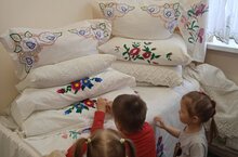Балаларны татар халкының милли бизәкләре, милли орнамент белән якыннанрак таныштыру, балаларда кызыксыну уяту, милли әйберләрнең үзләренә генә хас булган билгеләрен ачыклау, балаларга эстетик тәрбия бирү, татар милли сәнгатенә мәхәббәт һәм ихтирам тәрбияләү максатыннан кечкенәләр төркеме нәниләре белән милли бизәкләр белән таныштык.