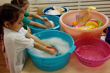 "Уенчыклар юабыз" 12.11.2021 Балаларда хезмәткә карата уңай мөнәсәбәт, хезмәт итү, өлкәннәргә булышу теләге тәрбияләү, балаларны үз бүлмәләрендәге уенчыкларны җыештырып, тәртипләп куярга, аларны юарга өйрәтү максатыннан зурлар төркеме кызлары белән уенчыкларны юдык.Үзләре уйнаган уенчыкларны бик теләп чиста итеп юып куйдылар. Кипкәч матур итеп урыннарына тезделәр. Эшләгәч балаларда шатлану, булышу хисе туды.