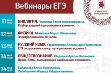 Продолжаем готовиться к ЕГЭ. В рамках городского проекта «Казанские учителя в онлайн» на этой неделе приглашаем учащихся и педагогов стать участниками следующих вебинаров:11 мая (15.00) - биология, Полякова Елена Александровна, ссылка на вебинар: https://youtu.be/FsNa1wvjaTg12 мая (15.00) - физика, Маннанов Марат Шамилевич, ссылка на вебинар: https://youtu.be/CHvDIYrQeo413 мая (15.00) - русский язык, Горшевикова Александра Германовна, ссылка на вебинар: https://youtu.be/C9r4Z3fEsYs14 мая (15.00) - обществознание, Юлдошев Арслан Хасанович, ссылка на вебинар: https://youtu.be/wWa5jzERyFw14 мая (16.30) - Сайдакова Елена Валерьевна, Хабибуллина Фарида Габдрахмановна "Как педагогам поддержать себя и учащихся в период сдачи экзаменов", ссылка на вебинар: https://youtu.be/8JA2biTFpMo15 мая (15.00) - математика, Хамидуллин Алмаз Нуртдинович, ссылка на вебинар: https://youtu.be/qx6dph6Qgw415 мая (16.30) - Пантелеева Вера Сергеевна, Шарафиева Алсу Рамилевна, "Подготовка к экзаменам: а мне не страшно!", ссылка на вебинар: https://youtu.be/LiIdMhBXGrc -