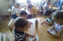 Дети подготовительной группы выполнили композицию "Ваза с фруктами, ветками, и цветами." Сначала дети рассказали об осени, о сборе уражая. В конце занятия они остались очень довольны своими работами.