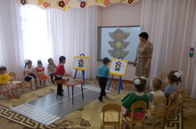 Цель: Уточнить представление детей о правилах поведения на улицах города. Закрепить знание о правилах дорожного движения, о сигналах светофора, о том, что люди ходят по тротуарам, переходят улицу по переходам при разрешающем сигнале светофора. Продолжать воспитывать внимательность, умение ориентироваться при переходе улицы. Активизация словаря за счет слов: тротуар, проезжая часть, пешеходный переход, дорожные знаки. Развивать зрительное внимание, общую и мелкую моторику. Развивать умение видеть то, что представляет опасность на дороге, для жизни и здоровья. Воспитывать культуру поведения на дороге и в транспорте.