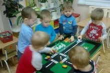 Побеседовали с детьми об улицах нашего города. Рассмотрели макет улицы. Узнали, что улица делится на проезжую часть и тротуар. Поиграли в подвижную игру "Цветные автомобили".