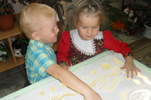 Наши дети тоже очень полюбили рисование песком. На подобных занятиях они знакомятся со свойствами различных сыпучих материалов. Ведь рисовать можно не только песком, но и солью, молотым кофе и даже крупой. Рисование песком доступно и полезно всем детям. Этот вид искусства помогает детям развивать мелкую моторику, воображение, творческий потенциал, тренирует память и внимание.