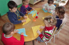 Известно, что праздничная сервировка стола не только вызывает эстетические чувства, но и повышает аппетит у детей. В детском саду ребята учатся дежурить и красиво сервировать стол. Так, с целью развития творческих способностей, мелкой моторики рук, создания у детей праздничного настроения, приобщения к прекрасному, увлекательному процессу подготовки стола к встрече гостей с детьми средней группы №2 был проведен мастер-класс по декоративному складыванию салфеток. Воспитатель Хисматуллина Л. Р. познакомила воспитанников с такими способами складывания салфеток, как «Трубочки», «Веер», «Лодочка». Дети с удовольствием складывали салфетки в технике оригами, а затем с радостью украсили ими обеденный стол.