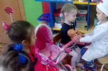 Неоценима роль сюжетно-ролевой игры, где дети учатся не только ролевым действиям, но и приучаются подчиняться правилам игры, в которых у них формируются нормы поведения в обществе. Дети осваивают и моральные нормы, заключённые в роли, мотивы и цели деятельности взрослых, их отношение к своему труду, к событиям общественной жизни, к людям, к вещам: в игре формируется положительное отношение к образу жизни людей, поступкам. Сегодня с малышами второй младшей группы была организована сюжетно – ролевая игра "Больница", во время которой разыграли сюжет "На приеме у врача". У детей была возможность побывать не только в роли пациента, но и в роли врача, в которой они почувствовали себя настоящими докторами.