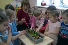 Малышей привлекает работа в уголке природы, им очень интересно видеть изменения, происходящие там. В данный момент дети с увлечением наблюдают за изменениями в росте луковиц, где Венера Вагизовна, объясняет им влияние света, тепла, влаги и питательных веществ в росте овощей, вызывая у своих воспитанников познавательный интерес к выращиванию лука, развивает наблюдательность, учит связывать причину и следствие изменениям в росте растений.