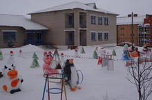 Благодаря творчеству и мастерству наших педагогов и родителей осуществлён проект построек из снега и льда на тему «В гостях у сказки». Наши поделки отличились не только сказочными персонажами, но и функциональными особенностями: дельфин – кольцеброс; снежный лабиринт для ходьбы, бега и ориентировки в пространстве детей; крепость -для метания; для развёртывания сюжетно-ролевой игры «В гости к трём медведям» - сами сказочные персонажи, ожидающие гостей; для прохождения по ограниченной и возвышенной плоскости с целью развития у детей координации движения – змея; для скатывания – горки; и …, конечно же ёлочки – для вождения хороводов с весёлыми Дедом Морозом, Снегурочкой и Снеговиками. Всё эти постройки сделаны с любовью для эстетического наслаждения взрослых и детей, а также для развития основных видов движений наших воспитанников.