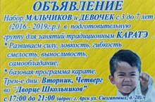 Внимание! Объявляется набор мальчиков и девочек от 3 до 7 лет в подготовительную группу для занятий традиционным КАРАТЭ.