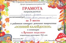 Вот и прошел финальный тур районного кокурса "Осенний калейдоскоп". Воспитанник старшей группы детского сада З. Зульфат занял 3 место в номинации "Лучшая поделка". Коллектив детского сада поздравляет его с победой и желает дальнейших успехов!