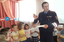 Дети средней группы показали родителям и инспектору ГИБДД Сабирову А. , как они изучают правила дорожного движения в детском саду, а потом инспектор и воспитатели Медникова Г. З., Саляхутдинова Г. Х. проверили самих родителей на знание ПДД,
