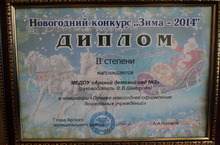 Коллектив нашего детского сада занял почетное второе место в Новогоднем конкурсе "Зима-2014", организатором которого является исполнительный комитет Арского муниципального района РТ, и был награжден дипломом II степени в номинации "Лучшее новогоднее оформление дошкольных учреждений". Поздравляем весь наш коллектив и желаем дальнейших успехов!
