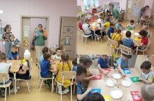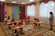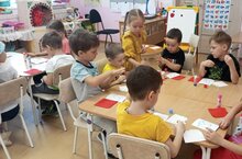 В рамках педагогического проекта "Иҗади остаханә" дети старшей группы представляют свои минипроекты. Сегодня воспитанница Л. Алия научила своих одногруппников аппликации татарского национального узора "Тюльпан", выполненной в технике торцевания из салфеток. Тему мастер-класса дети выбирают самостоятельно. Готовятся дома с родителями и потом учат своих друзей.