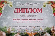 Наш детский сад участвовал в районном конкурсе снежных фигур "Новогодний калейдоскоп" и в организации детской площадки и проведении развлекательной программы в рамках новогодних праздничных мероприятий. По итогам проведения данных мероприятий детский сад был награжден Дипломами Главы Арского муниципального района РТ.