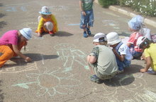 Дети любят рисовать не только на бумаге, но и на асфальте. Вот и сегодня дети рисовали цветными мелками. Рисунки получились яркими, красочными. Все остались довольны своей работой.