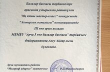 Балалар бакчасы тәрбиячеләр арасында уздырылган районкүләм "Иң яхшы мастер-класс" конкурсында "Актерлык осталыгы" номинациясендә 3 урын яулаган музыка тәрбиячесе Файзрахманова Алсу Айдаровнаны котлыйбыз.