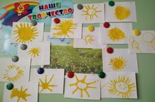 "Светит солнышко" Цель: учить создавать живописную композицию, с использованием теплых характеристик цветовой гаммы. Развивать у детей воображение, интерес к рисованию.