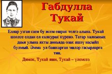Тарих бик күп шәхесләрне белә,Бөек шәхесләргә дөнья бай.Сәнгать дөньясында яши маяк булып,Мәңге яши, яшьни, яшь Тукай!Халкым күңеленә ак нур сиптеңКара төндә булдың якты ай,Шаулы язның тынмас тургаедайМәңге дәртле җырчы – син Тукай! -