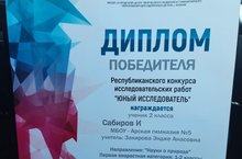 Ученик 2 класса Сабиров И. стал победителем Республиканского конкурса исследовательских работ "Юный исследователь" (руководитель Закирова Э. А.), который проходил в г. Казани "IT- лицей КФУ".