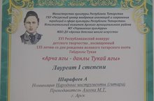 Туган тел һәм Халыклар бердәмлеге елы, бөек татар шагыйре Г.Тукайның 135 еллыгы уңаеннан республика күләмендә "Арча ягы-данлы Тукай ягы"исемле балалар иҗаты бәйгесе уздырылды. Әлеге чарада Арча балалар сәнгать мәктәбенең халык уен кораллары булегенә йөруче 4Б сыйныфы Шарифиев А. укучысы 1 дәрәҗә лауреат исеменә лаек булды.Котлыйбыз!