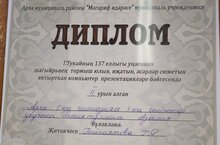 Г.Тукайның 137 еллыгы уңаеннан шагыйрьнең тормыш юлын, иҗатын, әсәрләр сюжетын яктырткан компьютер презентациялэре бәйгесендэ гимназиябезнең 5 нче Б сыйныфы укучысы Гатиятуллина Азалия 2 нче урынга,