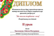 Иң милли тәрбияче-2025 20.03.2025 Тәрбиячебез Хисамиева Ләйсән Илсур кызы мәктәпкәчә белем бирү учреждениеләренең татар телендә белем бирүче тәрбиячеләре арасында үткәрелгән " Иң милли тәрбияче -2025 " республикакүләм бәйгесендә " Иң яхшы милли бәйрәм"номинациясендә 2 нче урынга лаек булды. Котлыйбыз! Киләчәктә дә матур уңышларыгыз күп булсын!