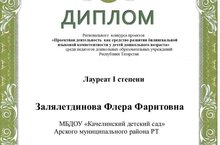 Воспитатель Залялетдинова Ф.Ф. участвовала в региональном конкурсе проектов и награждена дипломом Лауреата I степени. Флеру Фаритовну поздравляем. Желаем творческих успехов.