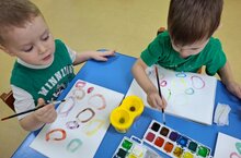 Кечкенәләр төркемендә дә рәсем ясарга бик яраталар. Бүген балалар тәрбиячеләре белән бергә төрле төстәге кыршаулар ясадылар. Гөлия Рәфкатовна балаларга пумала белән түгәрәк ясау һәм буяу алымнарын күрсәтте. Нәниләр шулай ук төсләрнең исемнәре һәм «түгәрәк» геометрик фигурасы турындагы белемнәрен камилләштерделәр.