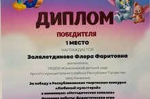 Воспитатель Залялетдинова Ф.Ф. участвовала в Республиканском творческом конкурсе "Любимый мультгерой" в номинации: "Методическая копилка"