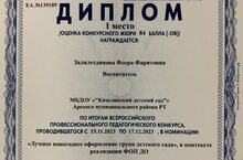 Воспитатель Залялетдинова Ф.Ф. участвовала во Всероссийском профессональном педагогическом конкурсе в номинации: "Лучшее новогоднее оформление групп детского сада", в контексте реализации ФОП ДО. Тема: "Сказочный детский сад"