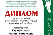 Бөек татар шагыйре-герой Муса Җәлил иҗатына багышланган балалар арасында беренче " Кызыл ромашка" республика конкурсында мәктәбебезнең 6 нчы класс укучысы Гарифуллина Рамилә 2 нче дәрәҗә дипломга лаек булды.