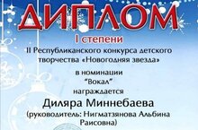 7 нче класс укучысы Миннебаева Диләрәне республика күләмендә үткәрелгән "Новогодняя эвезда" конкурсында 1 нче урынны алуы белән котлыйбыз.Киләчәктә зур уңышларга ирешергә язсын.