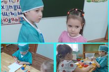 "Шифаханә" сюжетлы -рольле уен. 08.02.2023 Бурычлар: Балаларда табиб, шәфкать туташы һөнәрләренә карата кызыксыну уяту, әлеге һөнәр ияләренә карата хөрмәт тәрбияләү. Авыру кешеләргә карата сак караш, ярдәмчеллек, булышасы килү теләген үстерү. Аралашу культурасын, әдәбен камилләштерү. Катнашучылар: табиблар, шәфкать туташлары, авырулар, санитар. Уен барышы: Авыру кабул итү бүлмәсенә килә. Шәфкать туташы аны билгели, палатага озата. Табиб килеп аврудан хәле турында сораштыра, дәвалау билгели. Шәфкать туташы процедура кабинетында дарулар бирә, перевязкалар ясый, уколлар кадый, һ.б. Санитар палатада чисталык урнаштыра, урын- җирләрне алыштыра. Авырулар янына туганнары, дуслары хәл белергә килә. Әзерлек эше: Балалар бакчасындагы шәфкать туташы бүлмәсенә экскурсия оештыру. Табиб эшчәнлеген күзәтү. Әдәби әсәрләр уку. Медицина инструментларын, кулланылышын өйрәнү. Атрибутлар әзерләү. Җиһазлау: карават, урын- җир комплекты, савыт- саба, ак халатлар, башлыклар, рецепт язу өчен карандаш һәм кәгазьләр, фонендоскоп, тонометр, градусник, вата, бинт, пинцет, кайчы, губка, шприц, мазьләр, дару төймәләре, порошоклар, һ.б.