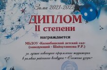 Районкүләм бәйге! 14.01.2022 Район күләмендә оештырылган"Карлы бизәкләр" бәйгесендә безнең балалар бакчасы Яңа елга "Иң яхшы бизәлгән территория" номинациясендә II дәрәҗә диплом белән бүләкләнде.Хезмәтебезне бәяләгән җитәкчеләребезгә, ярдәм күрсәткән өчен әти-әниләргә һәм бакча коллективына олы рәхмәтебезне белдерәбез.