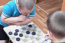 Балалар буш вакытларында шашка уены уйныйлар . Уенның кызган чагы.