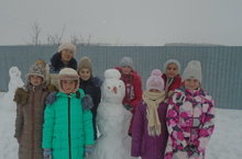 Обязательным пунктом режима для группы продленного дня являются игры на свежем воздухе. Дети, посещающие группу продленного дня, во время прогулки слепили снеговика.