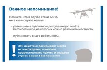 БПЛА һөҗүме очрагында пилотсызочкычлар очышының видеоларын халыкка җиткерергә ярамый. Бу турыда кисәтүләр булып тора. Һәм һава һөҗүменә каршы оборона эшләү видеосын интернет киңлекләренә урнаштырмау мөһим. Бу аларның урнашу урыннарын ача һәм Татарстан Республикасы гражданнарының иминлегенә куркыныч тудыра.