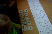 На столе лежат перевернутые кверху карточки с цифрами и кружочками от 1 до 5. Надо найти пару: у кого цифра 1, находит карточку с одним кружочком, и т.д.