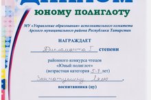 Безнең бакчада тәрбияләнүче Зиннатуллина Ләлә район күләмендә уздырылган "Юный полиглот" конкурсында 1 дәрәҗә дипломга лаек булды.Ана алдагы көнендә тагын да зур уңышлар телибез!
