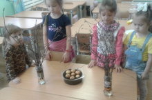 Балалар белән бер савытка суганнар, ә сулы шешәләргә агач ботаклары утырттык. Хәзер без көн саен аларда булган үзгәрешләрне күзәтеп торабыз. Сулары бетсә, су сибәбез. Балалар суганнарның кыяк чыгарганын, агач ботакларының яфрак ярганын күзәтәчәкләр. Соңыннан тәҗрибәбезгә нәтиҗә ясала.