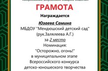 Россия күләмендә үткәрелгән пожар куркынычсызлыгы буенча үткәрелгән "Неопалимая купина" конкурсының муниципаль этабының нәтиҗәләре билгеле булды. Безнең бакчабыздан Набиуллина Р.Р., Хөсәйнова М.Р., Гарипов З.З, Лотфуллин С.С. катнашучы сертификатларына ия булдылар. Ә Юзаева С.Д. 2 нче урынга лаек булды. Котлыйбыз!!! Алда да уңышлар юлдаш булсын!!!