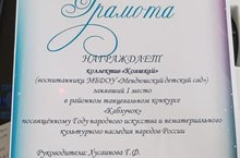 Безнең бакчабызның "Кояшкай" бию төркеме районкүләм үткәрелгән "Каблучок" бию конкурсында беренче урынны яуладылар. Котлыйбыз!!! Алда да бик күп уңышларга ирешергә язсын!!!