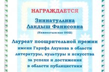 Зиннатуллина Ландыш - ученица 8 класса нашей школы стала лауреатом районной поощрительной премии имени Гарифа Ахунова в области литературы, культуры и искусства за успехи и достижения в области публицистики в 2014 году