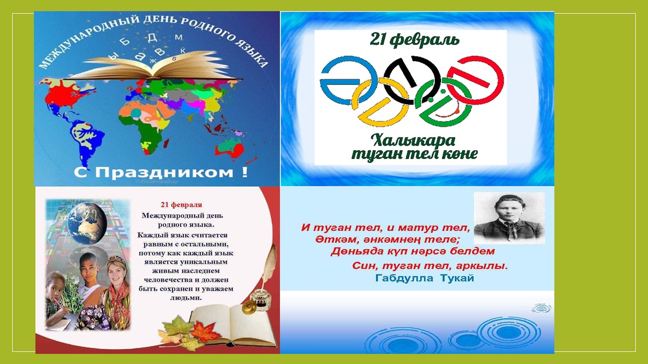 21 февраль — Халыкара туган тел көне буларак билгеләп үтелә. Халкыбызның гореф-гадәтләрен, тарихын, мәдәниятын мең еллар буенча саклап килүче байлык ул - тел. Менә нинди көчкә ия безнең туган телебез! Телсез – халык үзе дә була алмый, халыксыз – тел дә юк. Шуңа күрә, телгә мәхәббәт ул- бер үк вакытта туган халкың, туган илеңә дә мәхәббәт дигән сүз.Родной язык бесценен для каждого из нас. На родном языке мы говорим наши первые фразы и яснее всего высказываем свои мысли. Это та основа, на которой все люди строят свою личность с мгновения своего первого вздоха, и он то, что ориентирует нас на протяжении всей жизни. Он является способом, с помощью которого можно научить уважать себя, свою историю, свою культуру, и главное, других людей со всеми их особенностями.