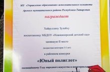 Поздравляем воспитанницу старшей группы Хайруллину Азалию и воспитателя Самигуллину Г.М. с заслуженным 2 местом в районном конкурсе "Юный полиглот"! Дальнейших успехов!